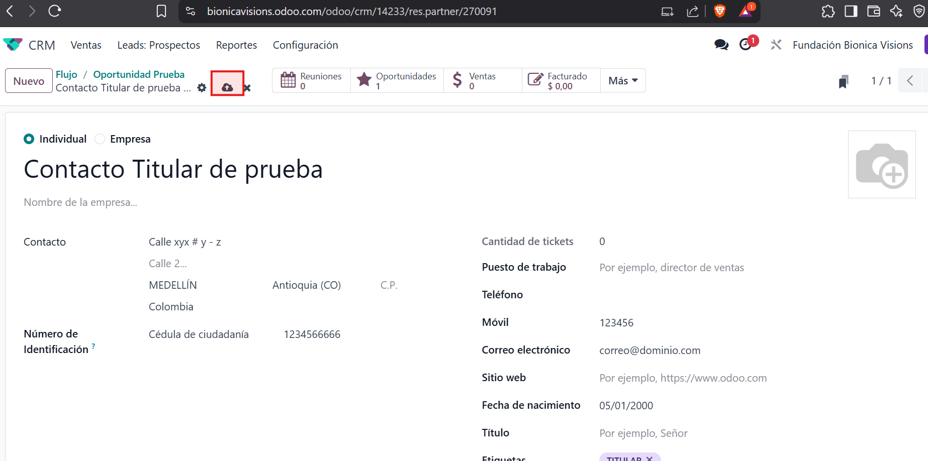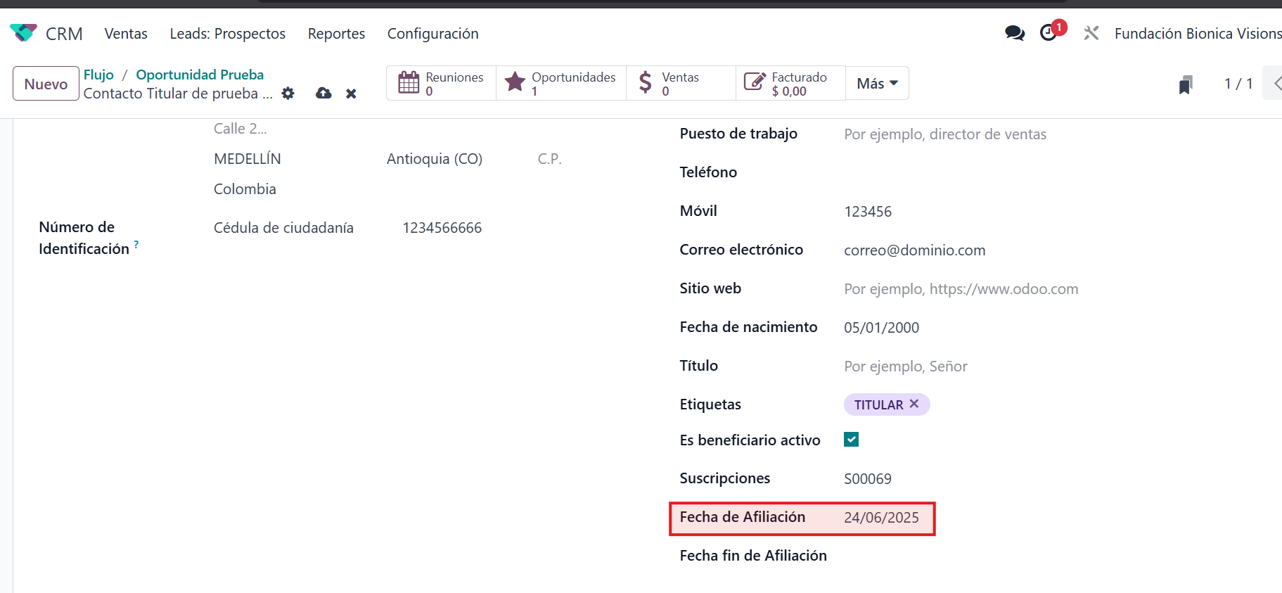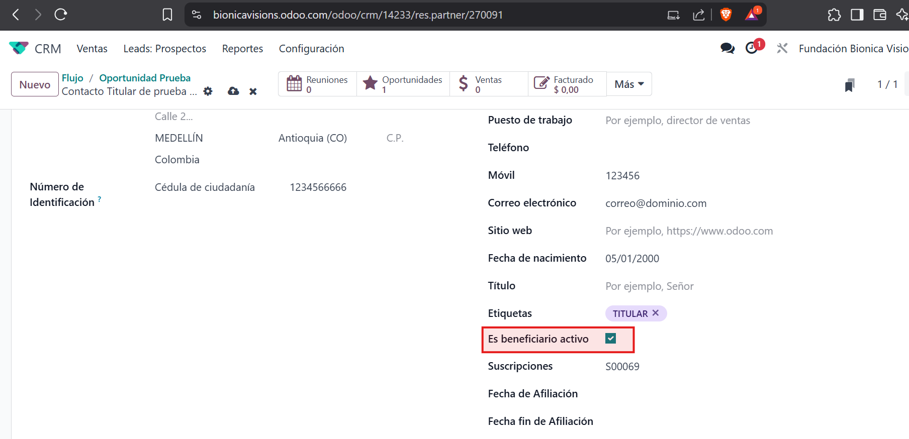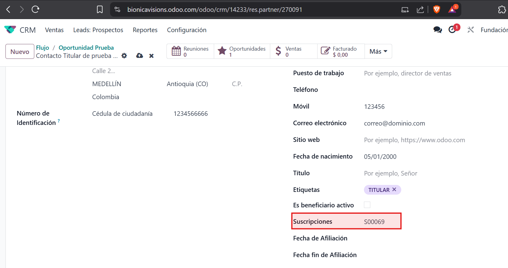 - Continuando en el contacto que se creo y vinculamos al titular con el plan principal o convenio empresarial. Para ello, localice el campo 'Suscripciones' e ingrese en él el número de referencia de la suscripción del convenio (ej. S00069), el cual se generó al momento de la negociación con la empresa del cliente.