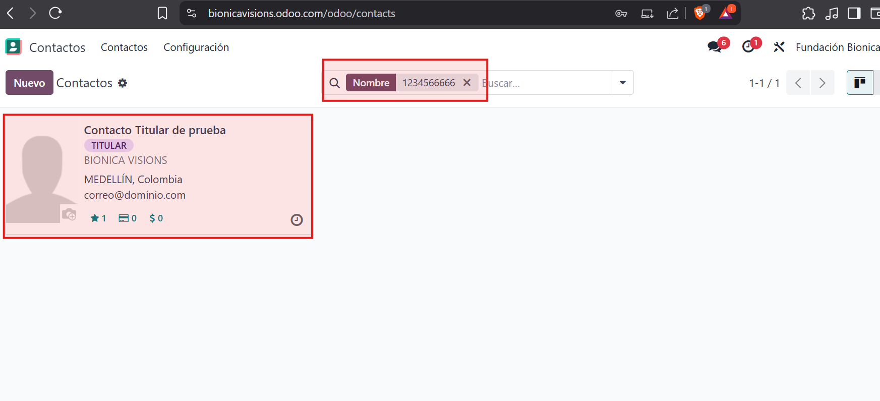 - En el caso de que el contacto ya exista en Odoo, comience por localizar y acceder a su ficha. Utilice la barra de búsqueda para encontrarlo, preferiblemente por su número de documento para mayor precisión.