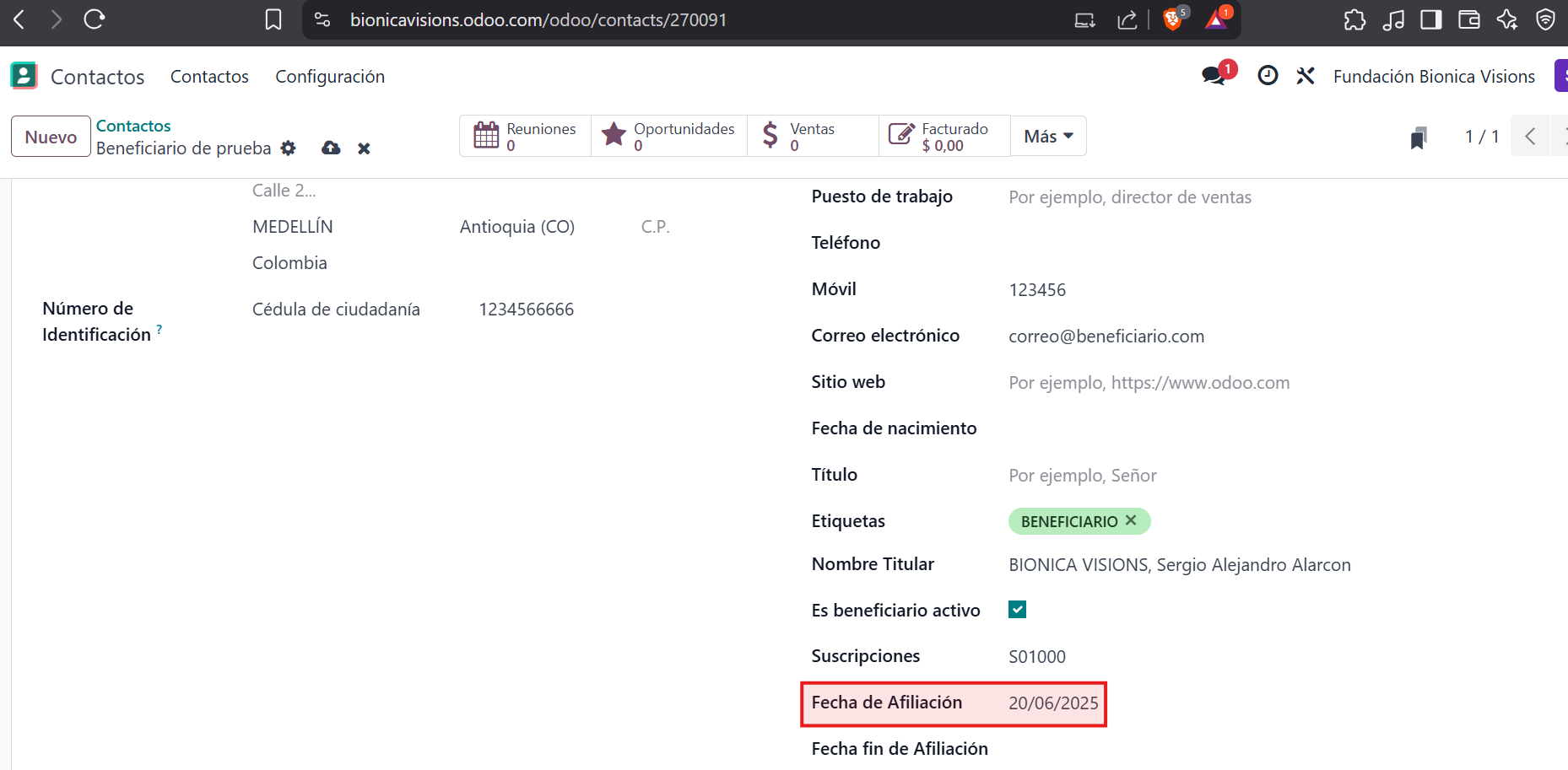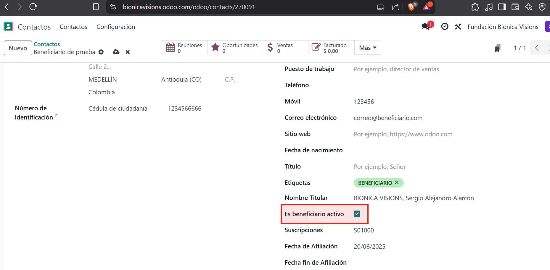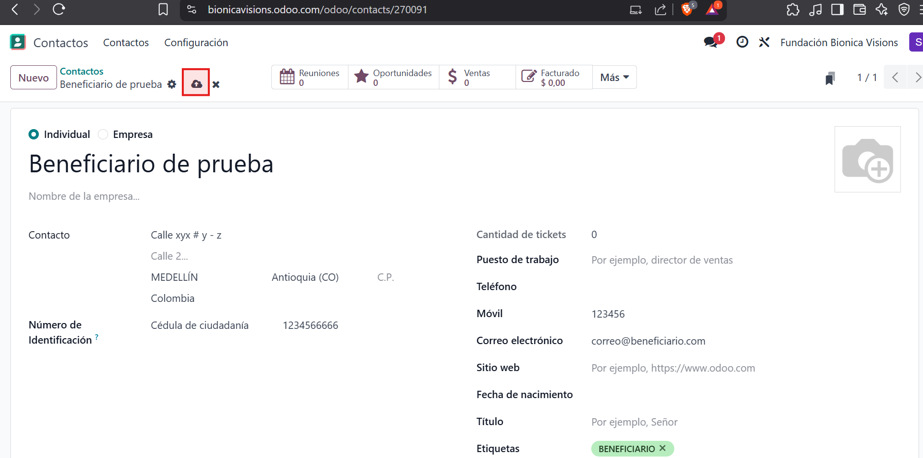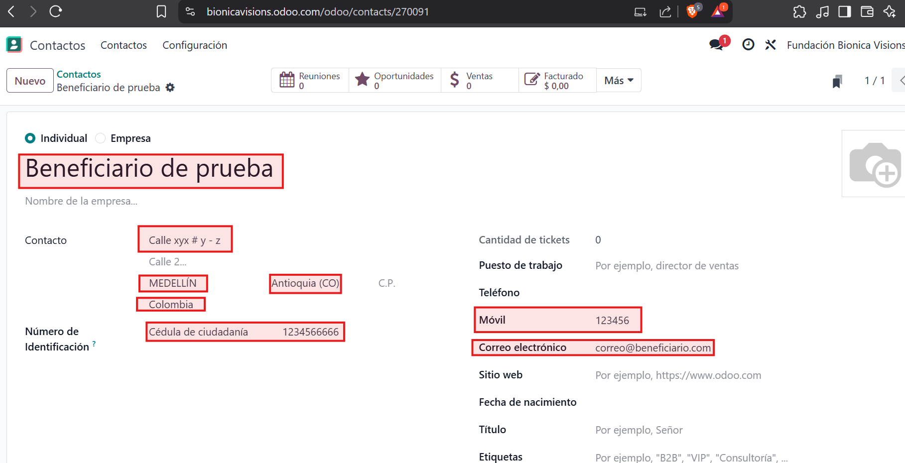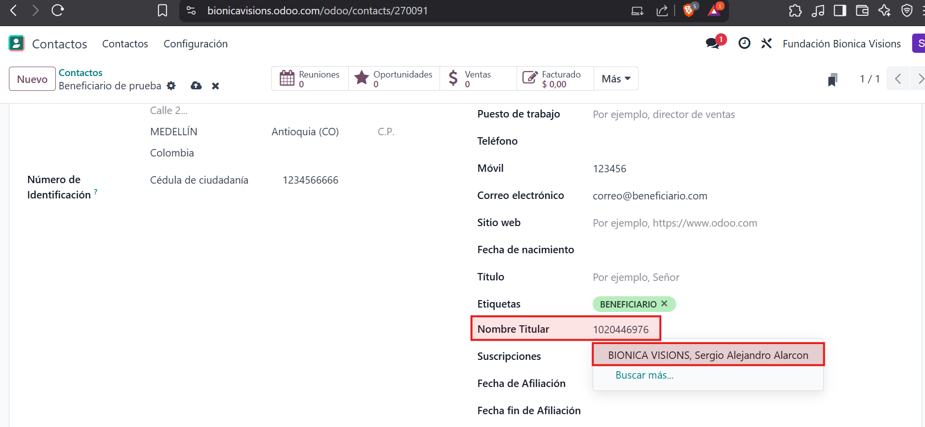 - En el caso de que un beneficiario ya exista como un contacto en Odoo, comience por localizar y acceder a su ficha. Utilice la barra de b煤squeda para encontrarlo, preferiblemente por su n煤mero de documento para mayor precisi贸n.