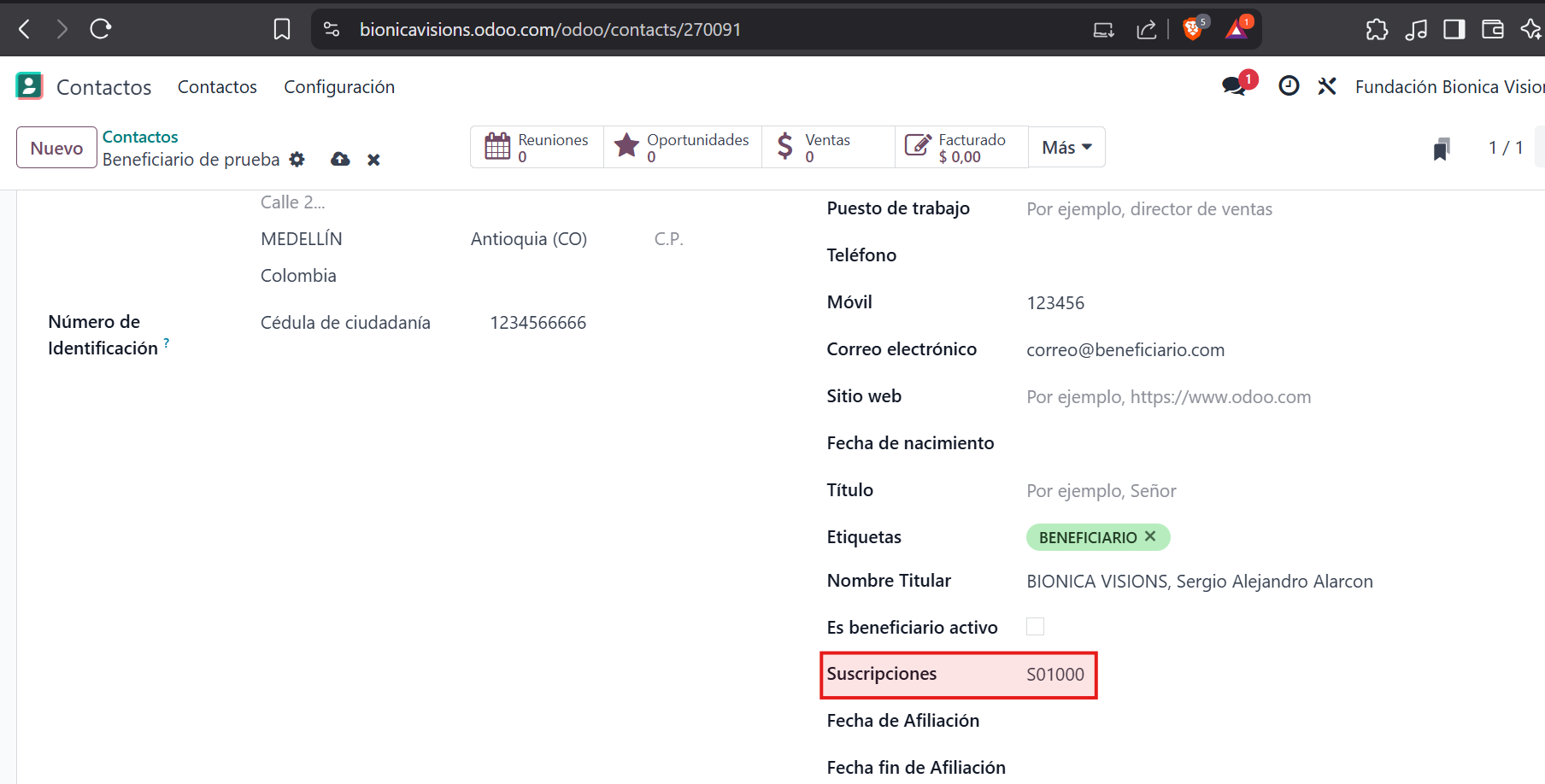 - Un paso crucial es vincular al beneficiario con el plan principal. Para ello, localice el campo 'Suscripciones' e ingrese en 茅l el n煤mero de referencia de la suscripci贸n del titular (ej. S00997), el cual se gener贸 al momento de la afiliaci贸n inicial.
